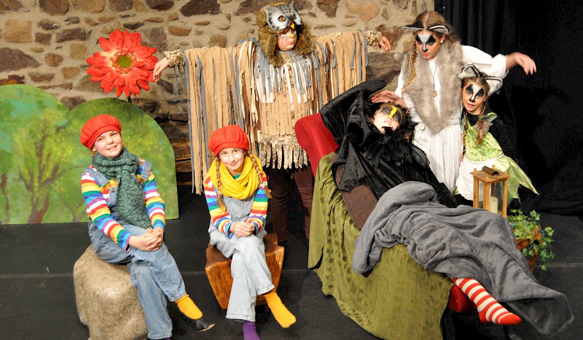 Bildunterschrift: Erfolgreiche Premiere des Kinderensembles der Burgbühne: Die Eule hat die gute Idee, die Dachs-Familie betreut den Kranken, die Erzählerinnen und alle anderen Freunde des kleinen Raben bemühen sich, dass er bald wieder gesund wird. ©Johanna Graupe